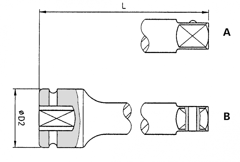Förlägning 1/2" x 200 mm med fjädrande pinne för säkring av krafthylsa |D2 = 25 mm | L = 200 mm | Vikt 0,34 Kg |