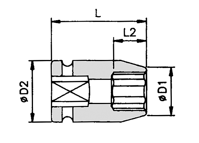 KraftHylsa 1/2" x 1-1/16" Tum 6-kant |Nyckelvidd 1-1/16" Tum | D1 = 38 mm | D2 = 38 mm | L = 40 mm | L2 = 16 mm | Vikt 0,17 Kg |