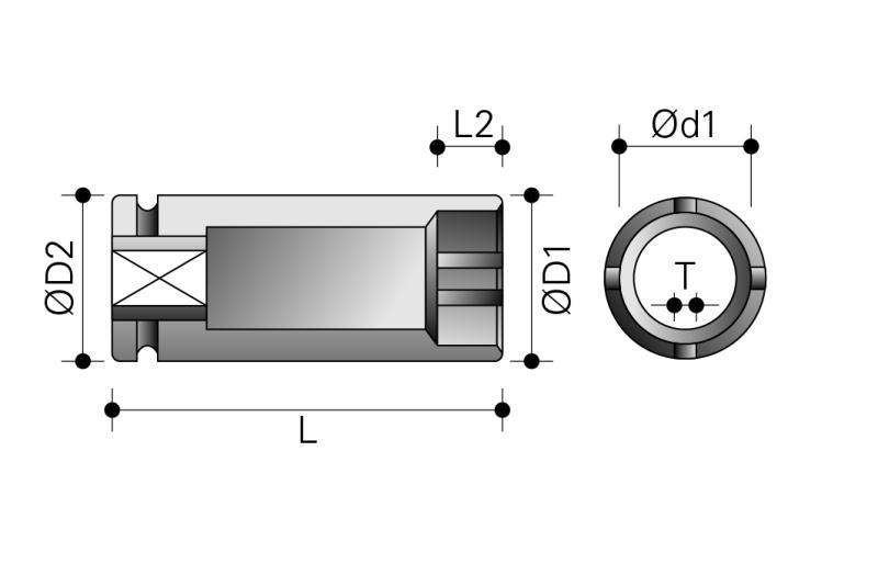 Krafthylsa 3/4" för KM12 kullagermutterFör KM 12 kullagermutter T =6,5 mm | D2 = 54 mm | D1 = 88,5 mm | d1 = 74,5 mm | L2 = 13,5 mm | L = 90 mm | Vikt 1,63 Kg