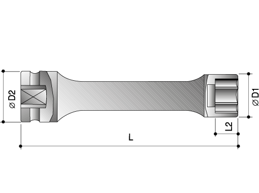 Nyckelvidd 30 mm för M 20 skruv | D1 = 45 mm | D2 = 44 mm | L = 400 mm | L2 = 30 mm | Vikt 3,26 Kg |