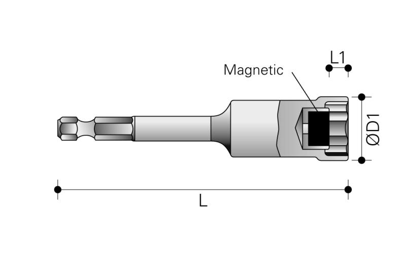 Skruvhållare 1/4" x 12 mm magnetisk Längd 55 mm |Nyckelvidd 12 mm D1 = 17 mm | L1 = 5,5 mm | L = 55 mm | Vikt 0,036 Kg