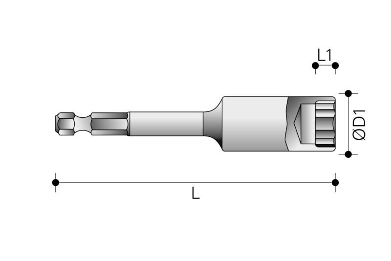 Skruvhållare 1/4" x 8 mm Längd 75 mm |Nyckelvidd 8 mm för M5 skruv | D1 = 12 mm | L1 = 5 mm | L = 75 mm | Vikt 0,032 Kg